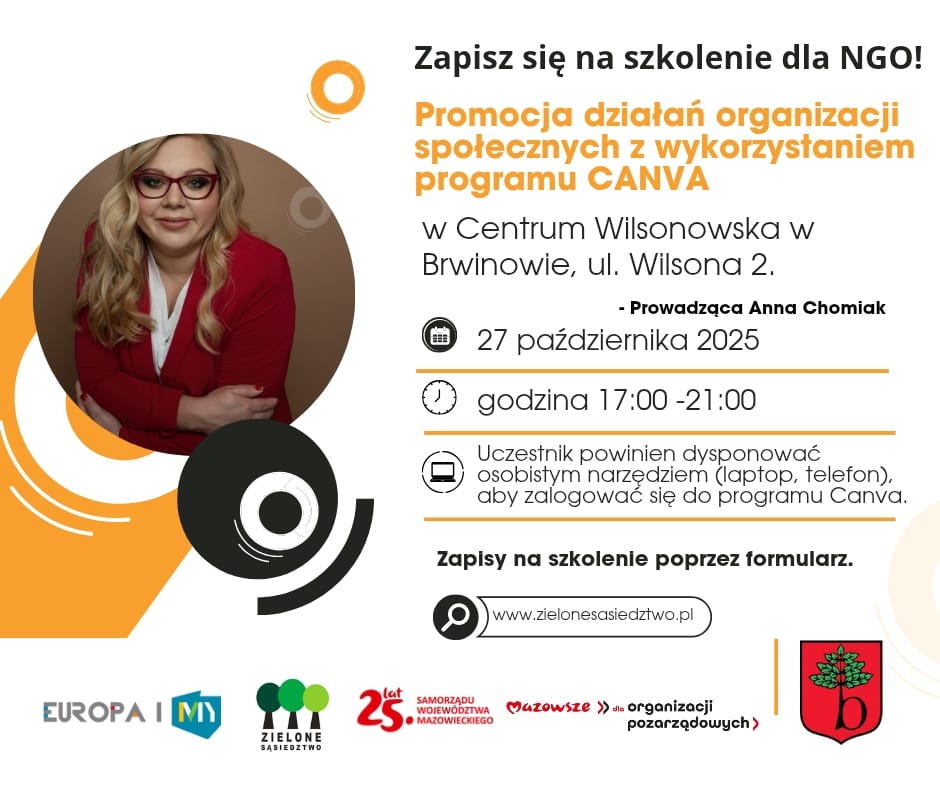 Wspólnie z Gminą Brwinóww ramach spotkań Poniedziałki dla organizacji pozarządowych zapraszamy przedstawicieli organizacji pozarządowych na praktyczne szkolenie, podczas którego nauczysz się, jak tworzyć atrakcyjne materiały promocyjne w Canvie. Miejsce: Centrum Wilsonowska, Brwinów, ul. Wilsona 2 Data: 27 października 2025 r. Godzina: 17:00–21:00 Prowadząca: Anna Chomiak Zapisy poprzez formularz https://forms.gle/pSV8QkFiTVKUkZ1E9 Uczestnicy proszeni są o zabranie własnego urządzenia (laptop, tablet lub […]